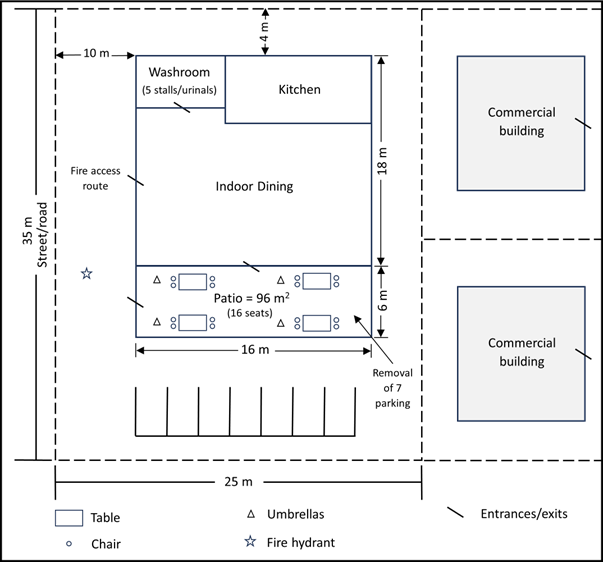 The maximum occupant load of the principle business and patio according to the Ontario Building Code; and