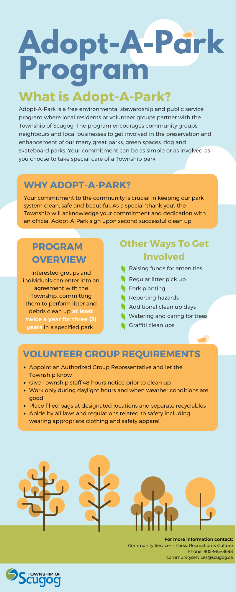 To adopt a park, contact recreation@scugog.ca with your Volunteer Group Pledge Form. The Township considers your safety when making decisions about the Adopt-a-Park program. Our Adopt-a-Park Safety Guidelines help keep our volunteers safe.